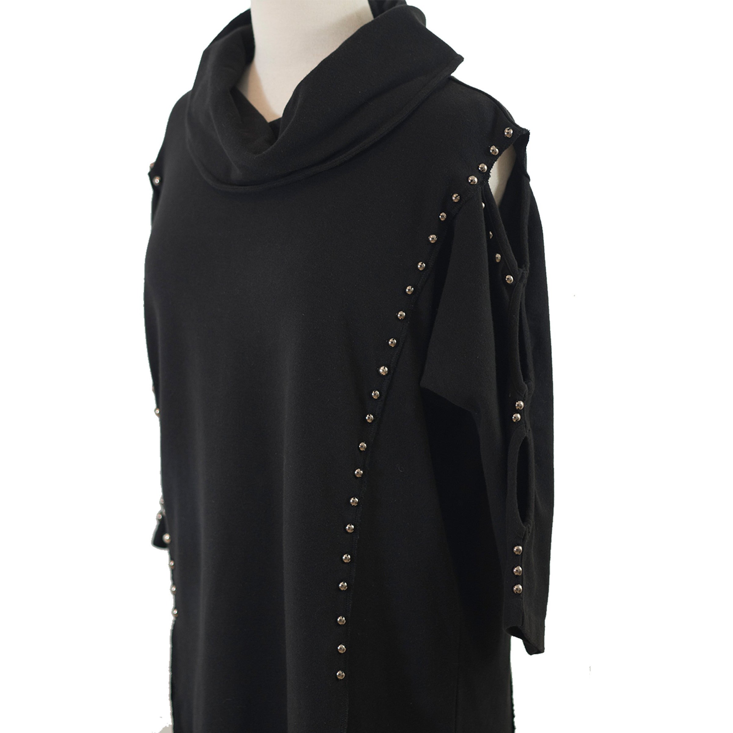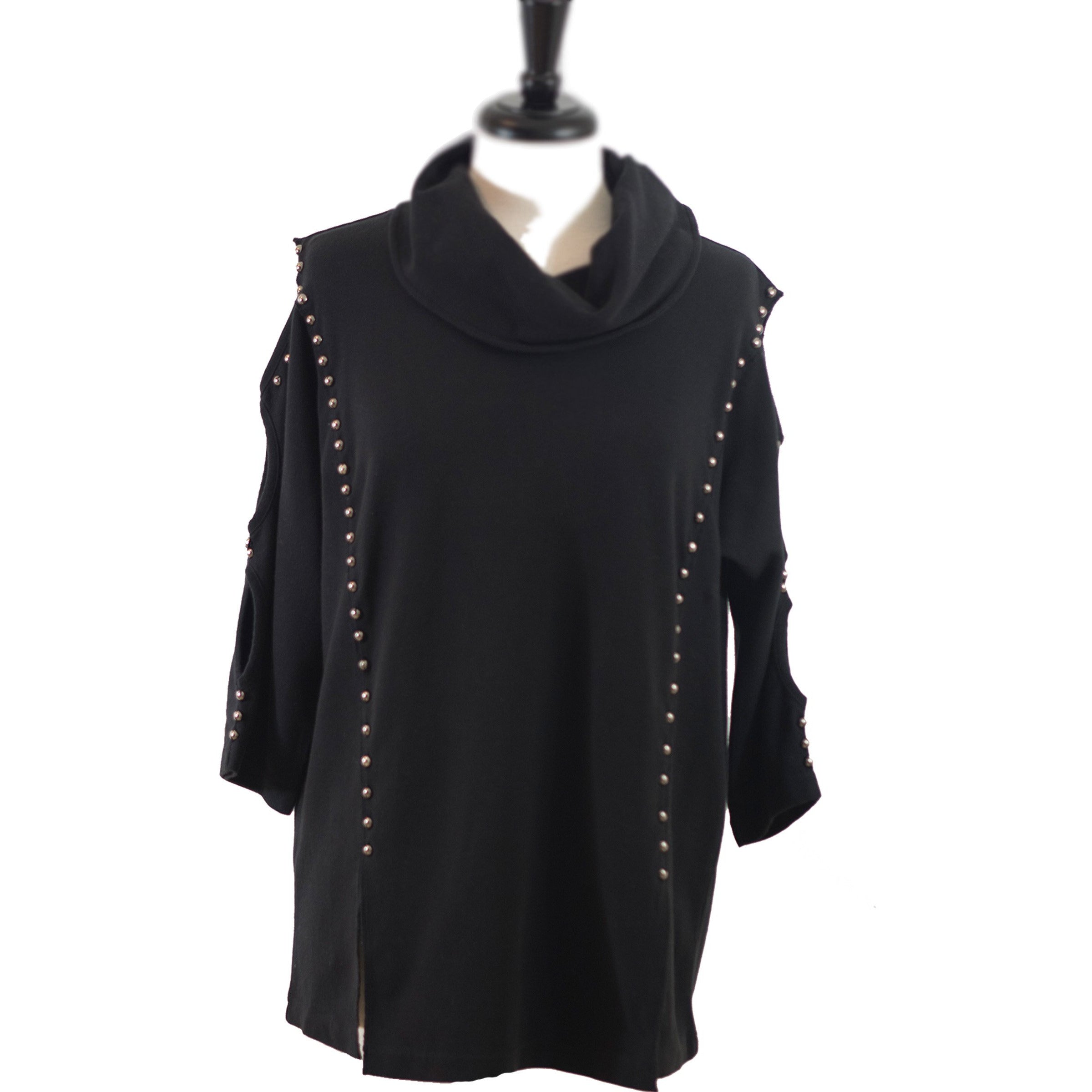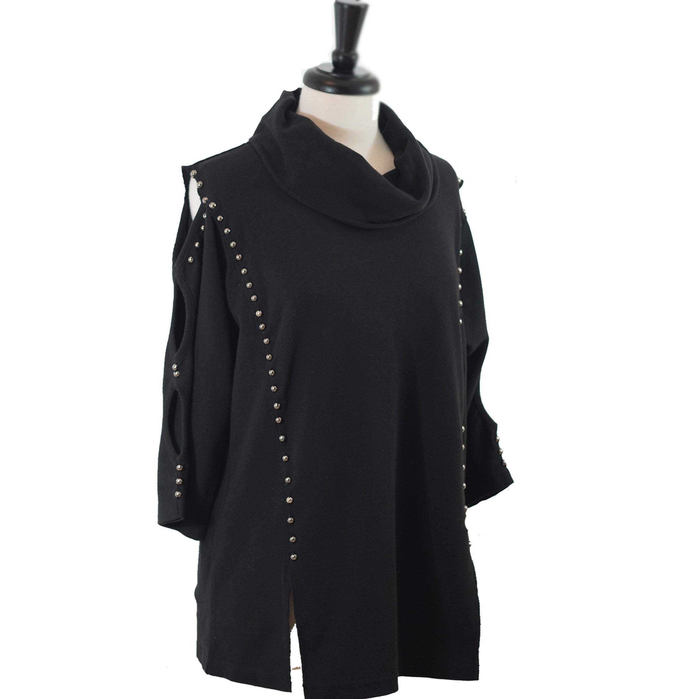 Obtain a polished look with this black cowl neck tunic which features openings down the sleeve. Studded accents highlight the curvature of this tunic.