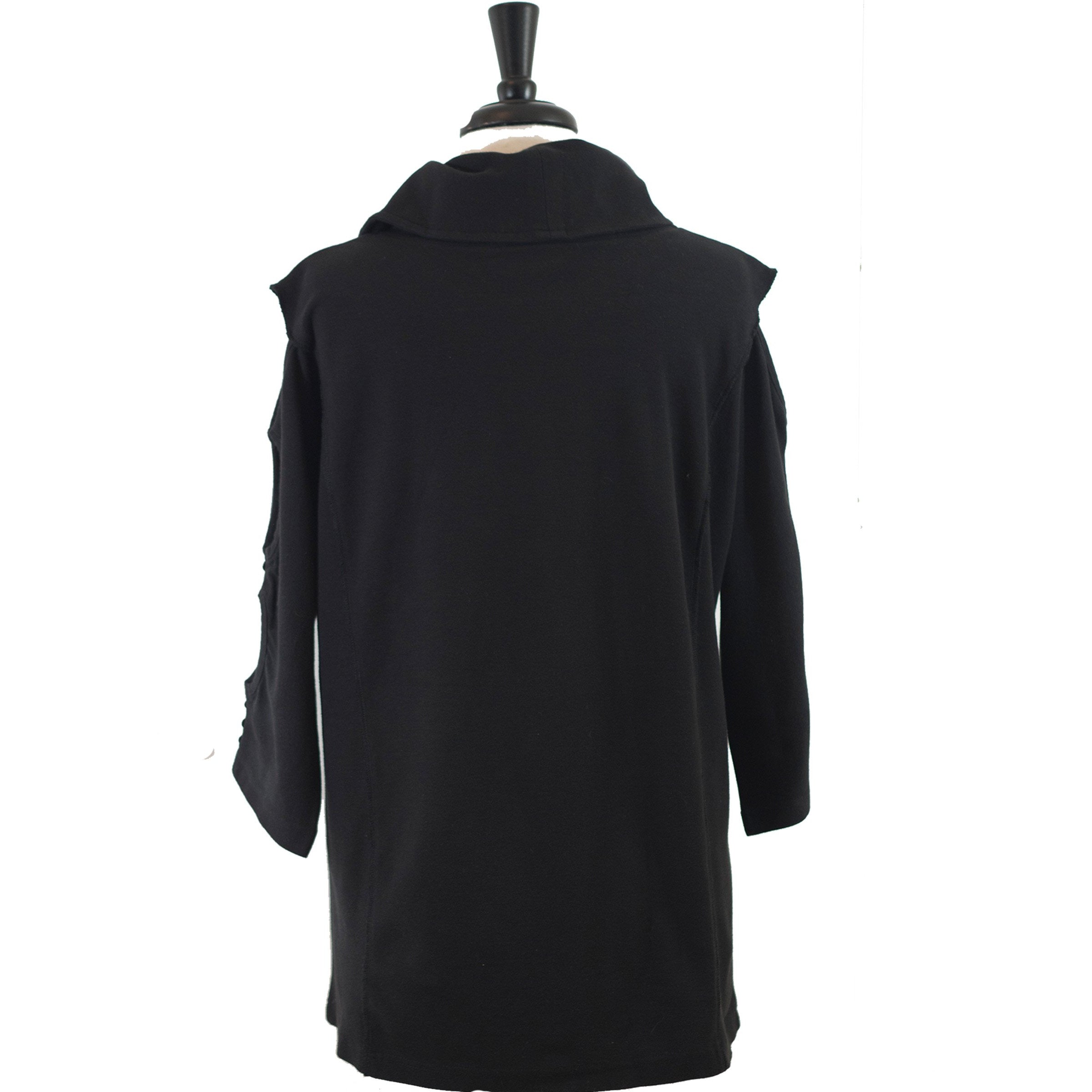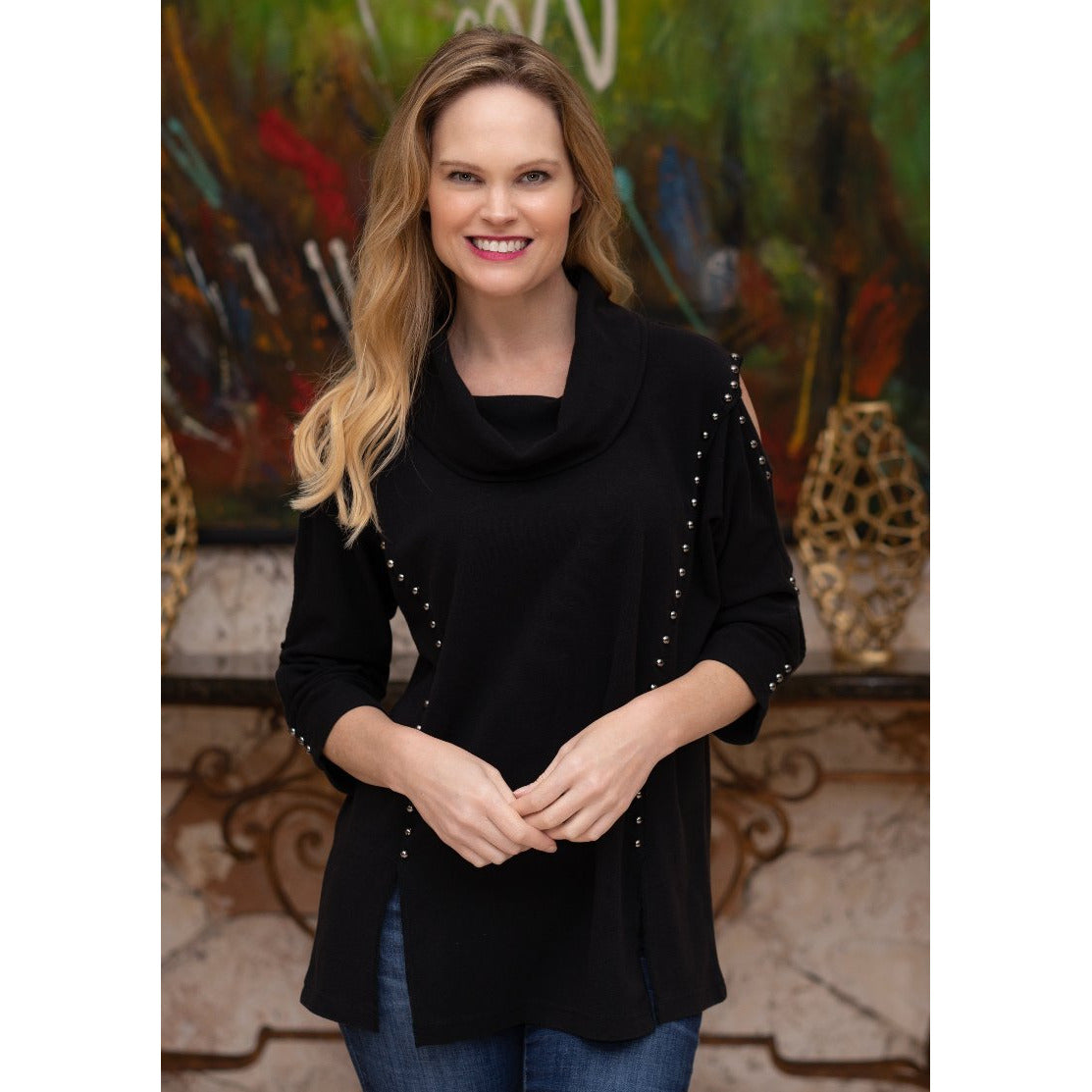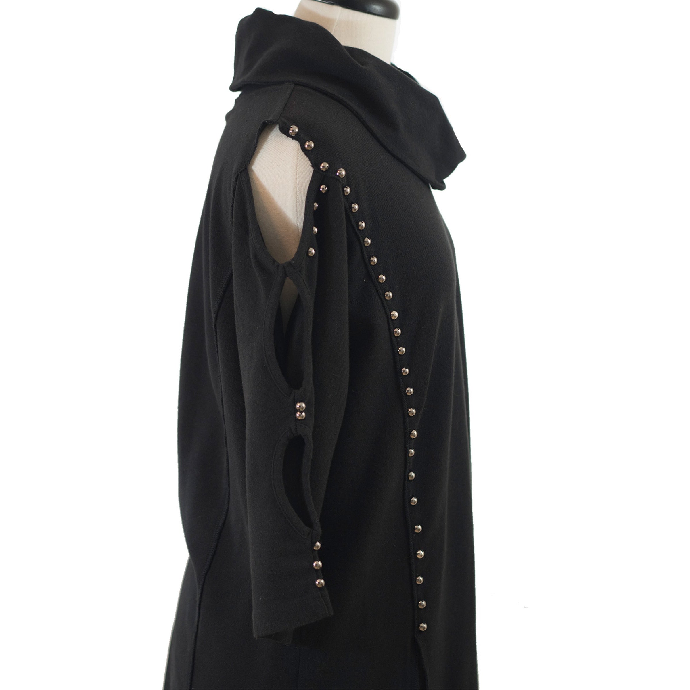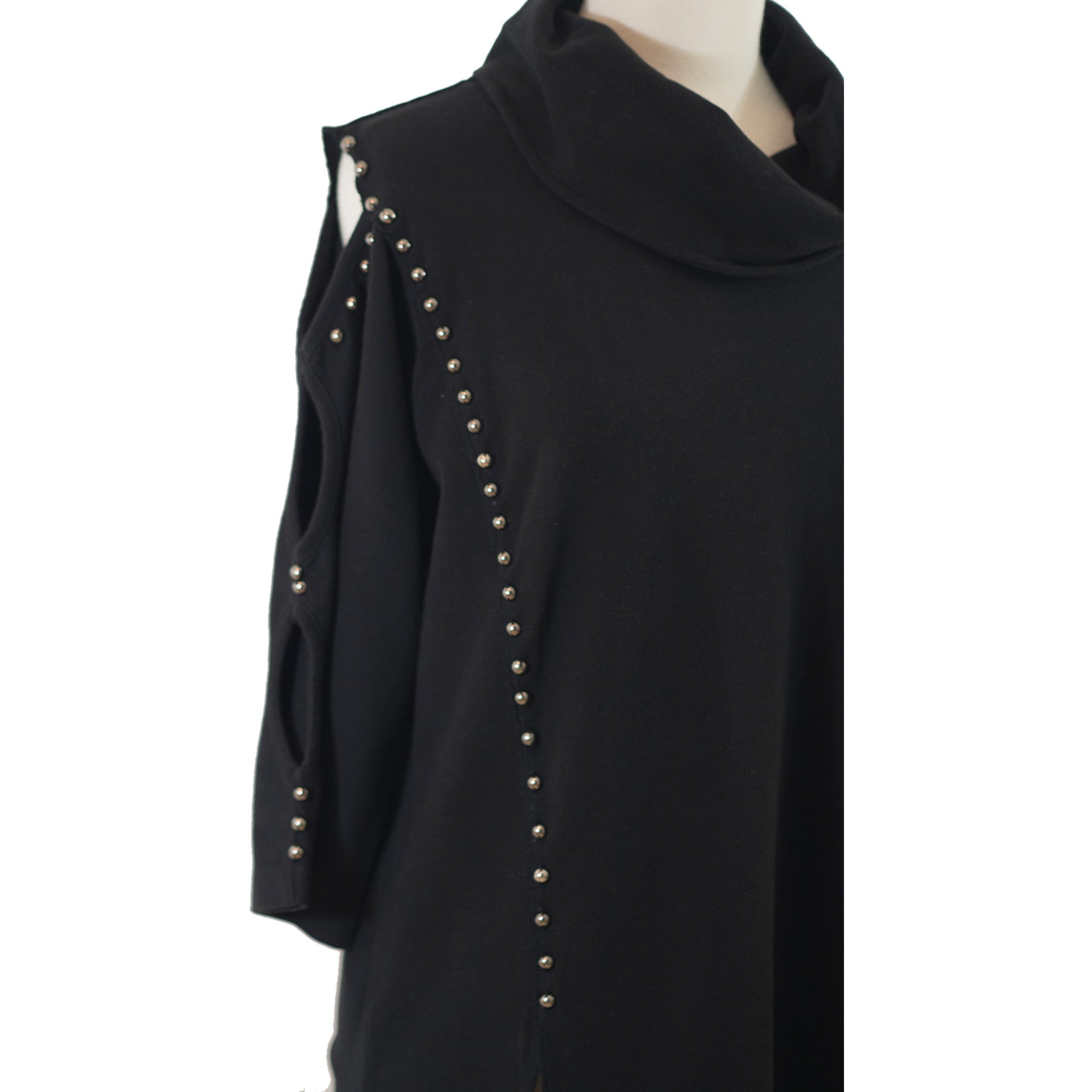 Obtain a polished look with this black cowl neck tunic which features openings down the sleeve. Studded accents highlight the curvature of this tunic.