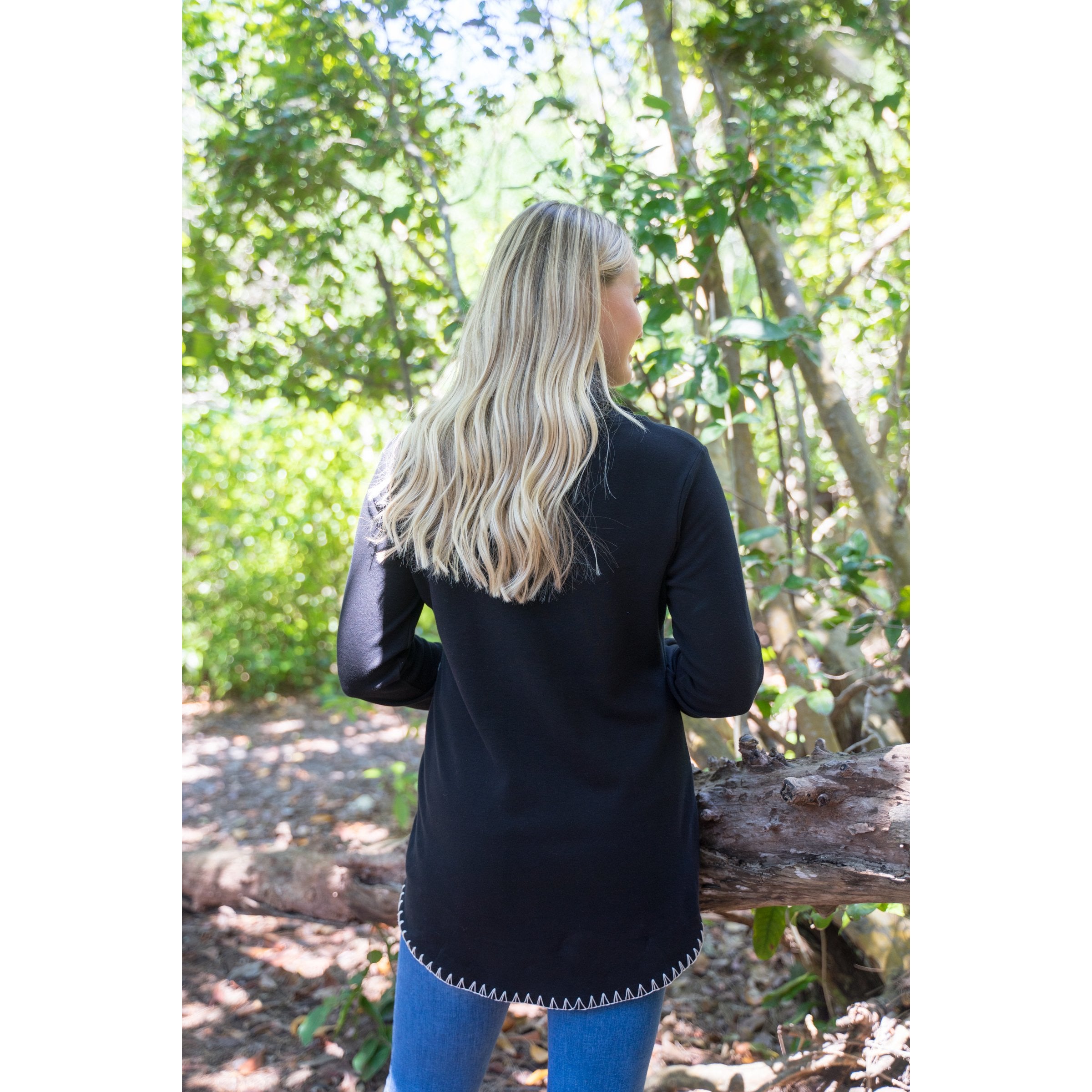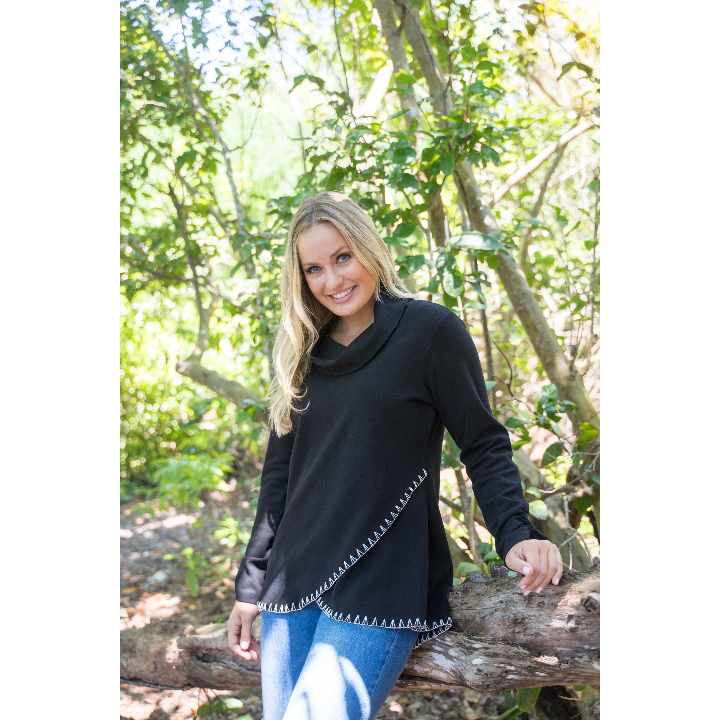 Black cozy cowl neck tunic with Ivory hand-done Whip Stitching. Also has cute gathered sleeves