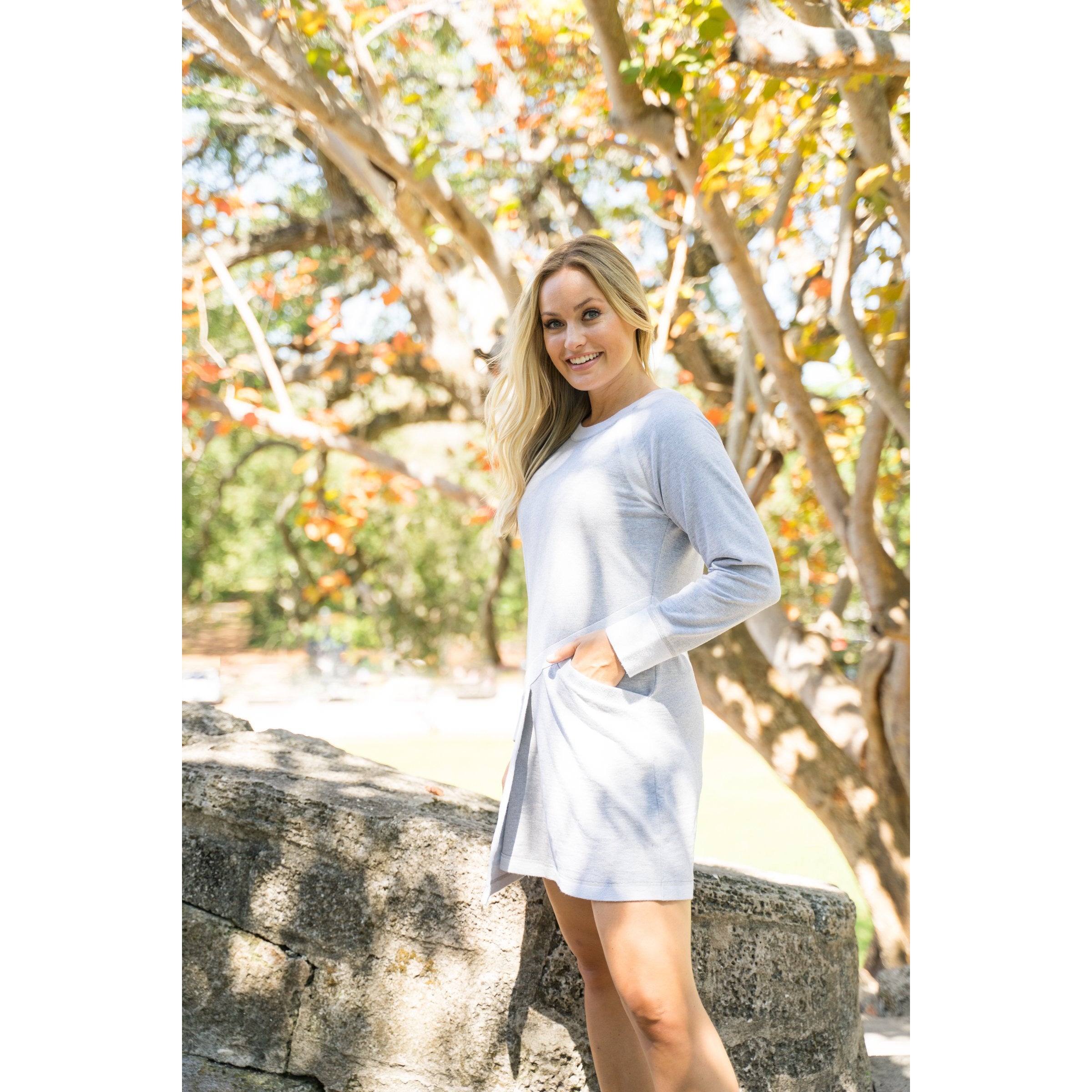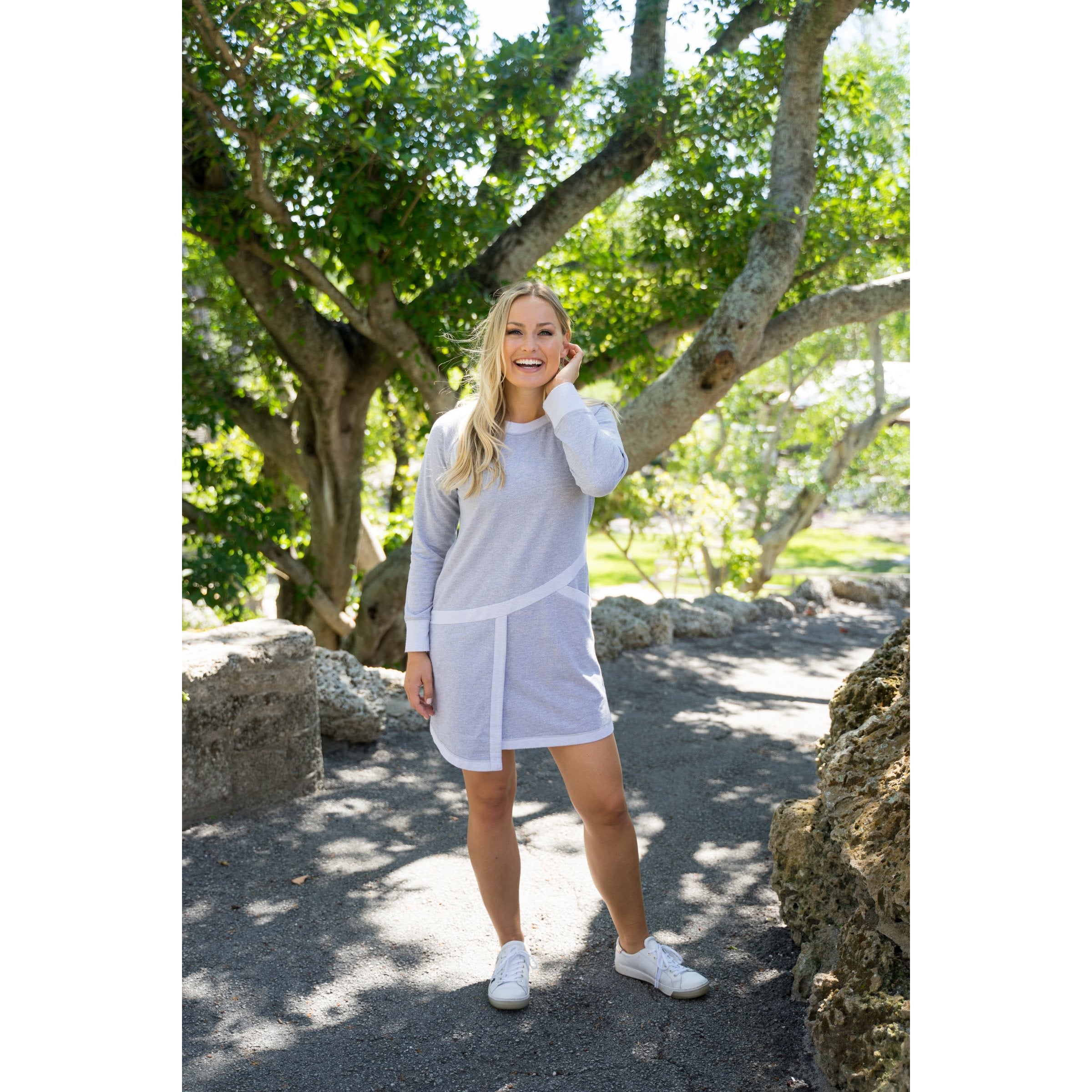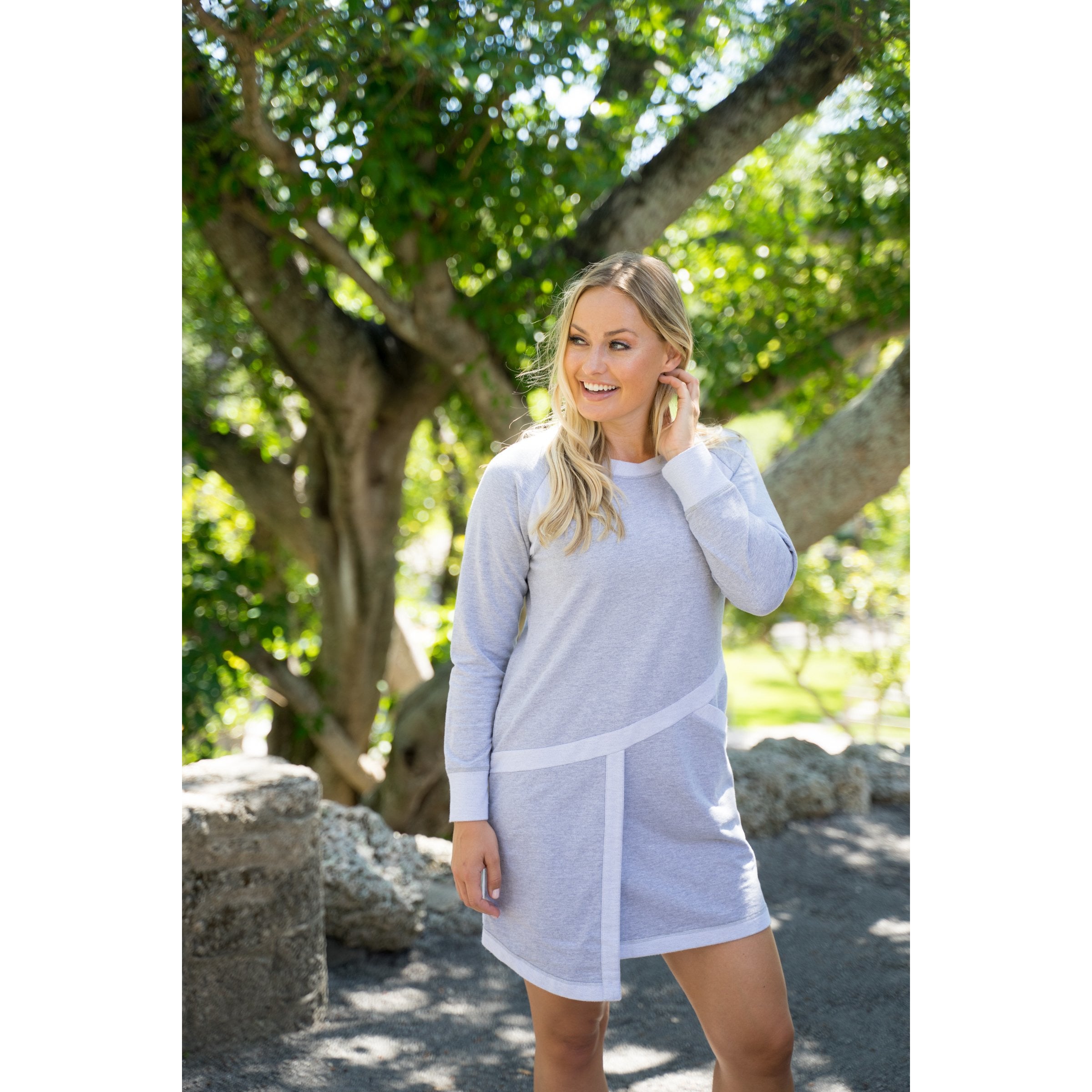 Heather Grey sweatshirt dress with reverse angle trim.