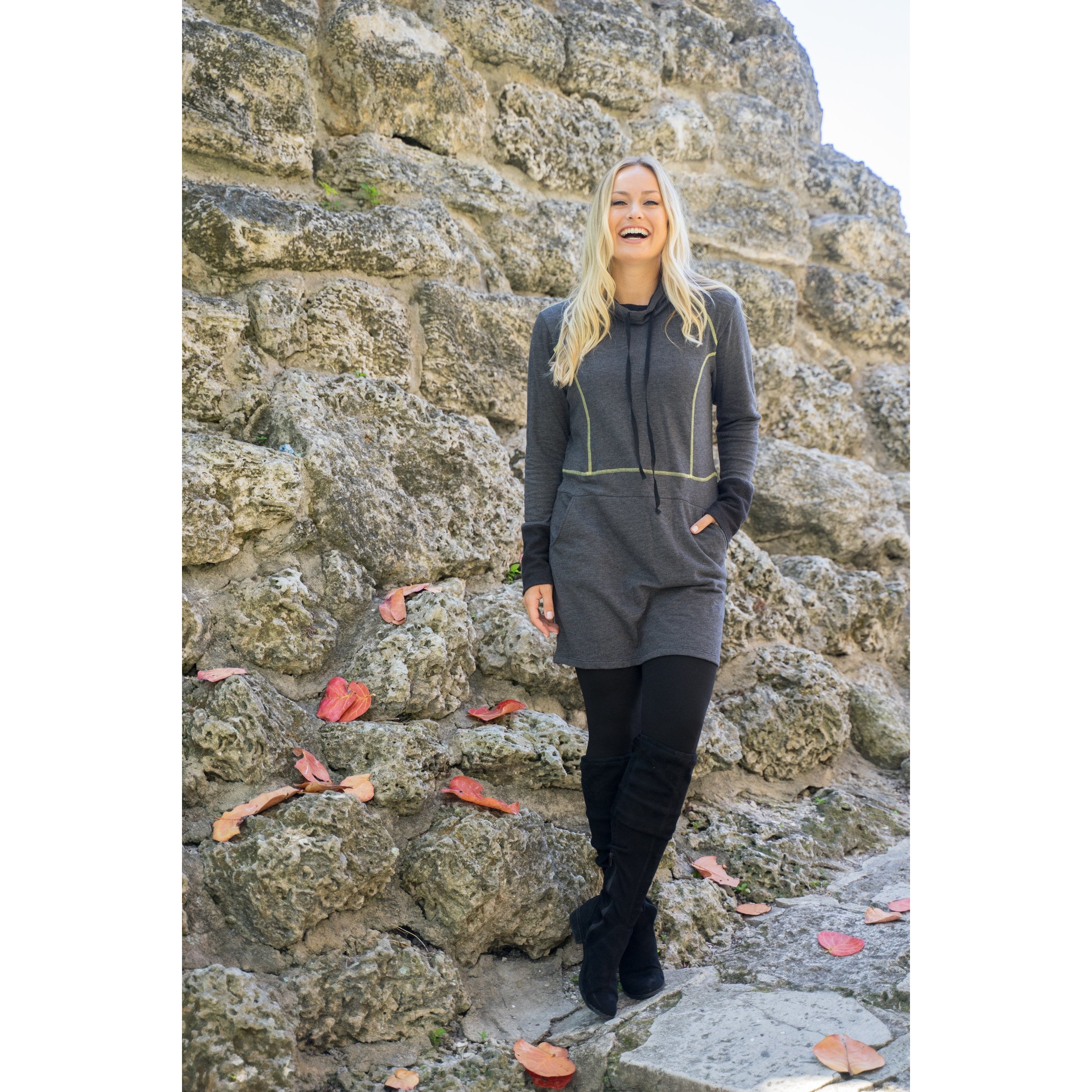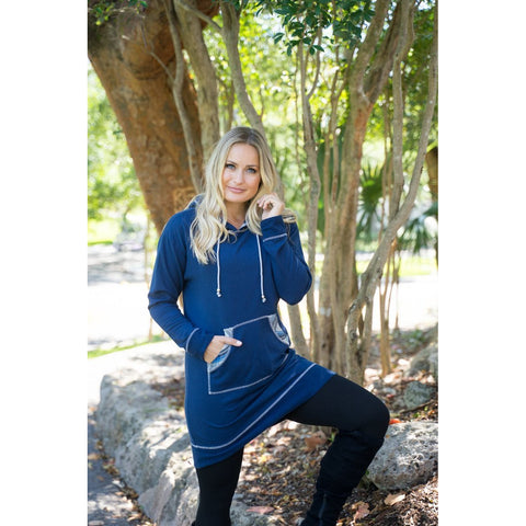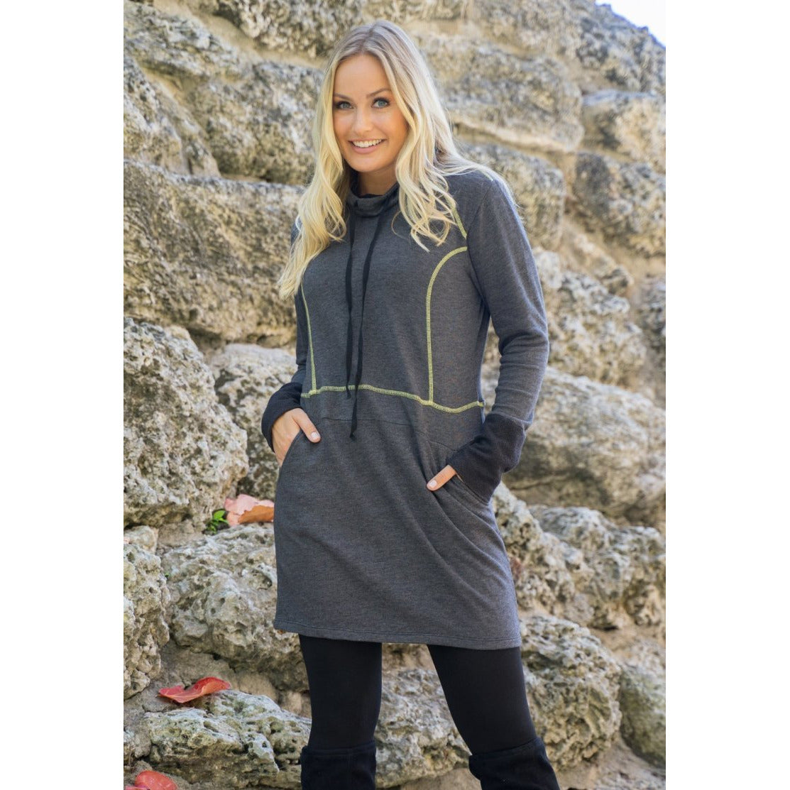 Dark Heather Grey sweatshirt dress with a drawstring hood and front pockets.