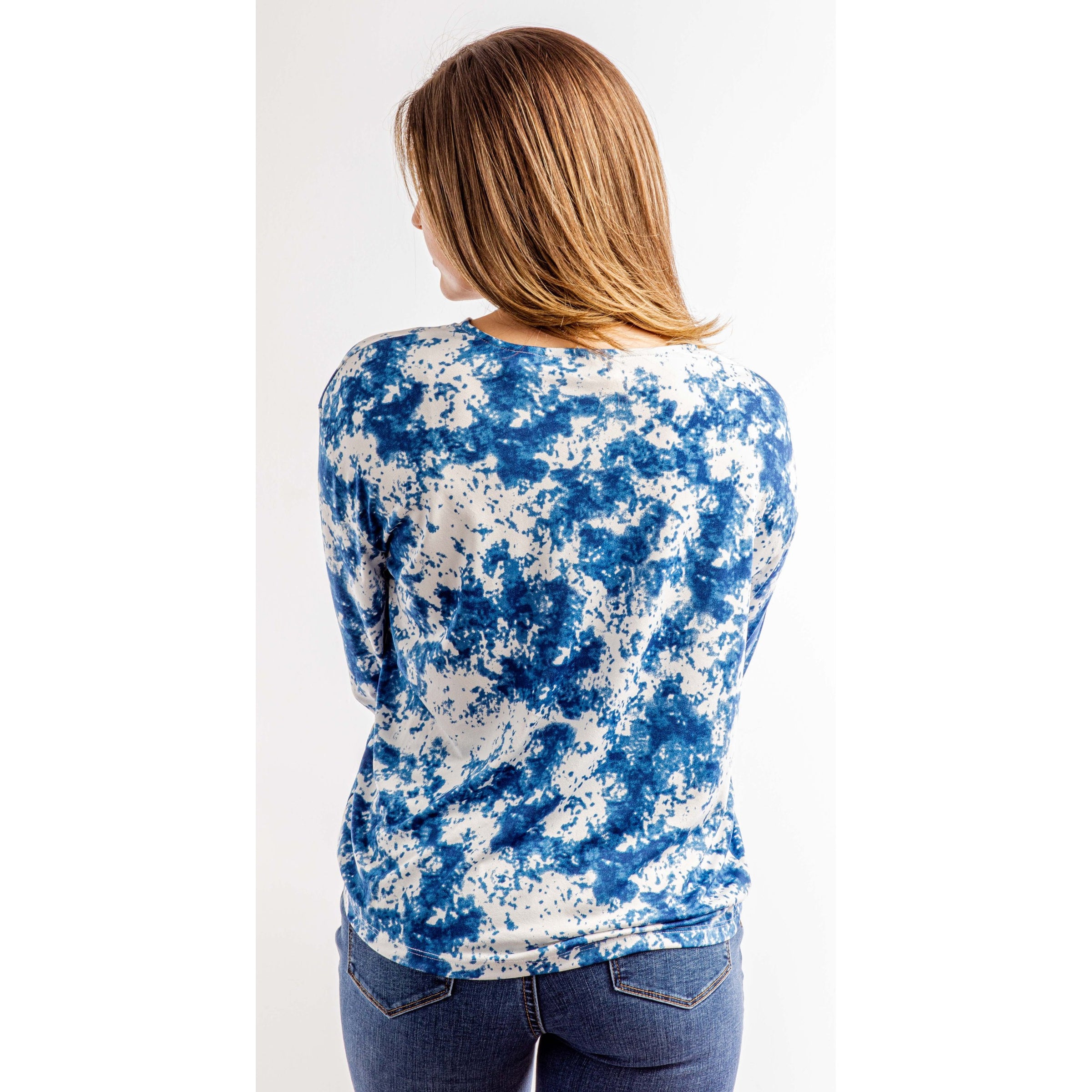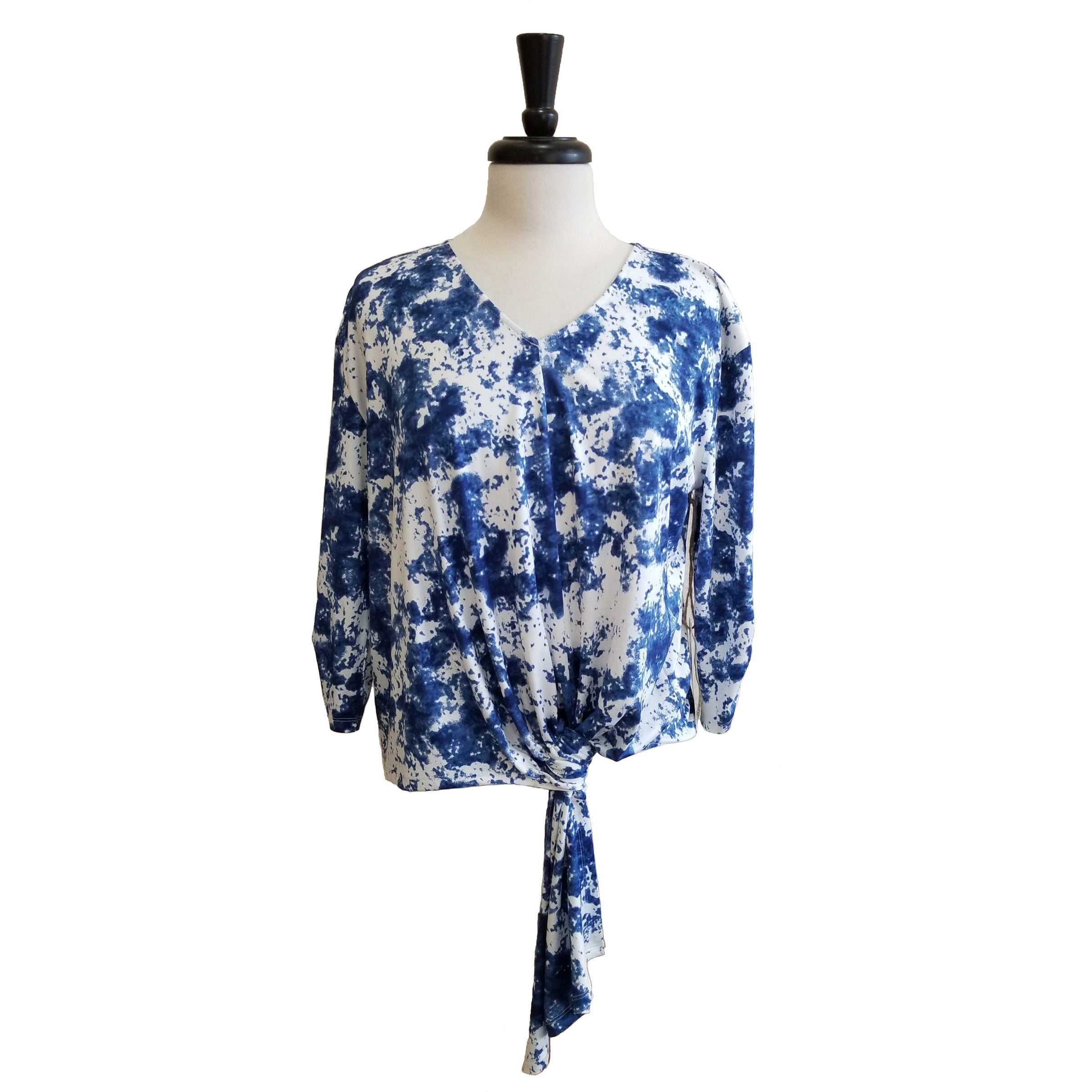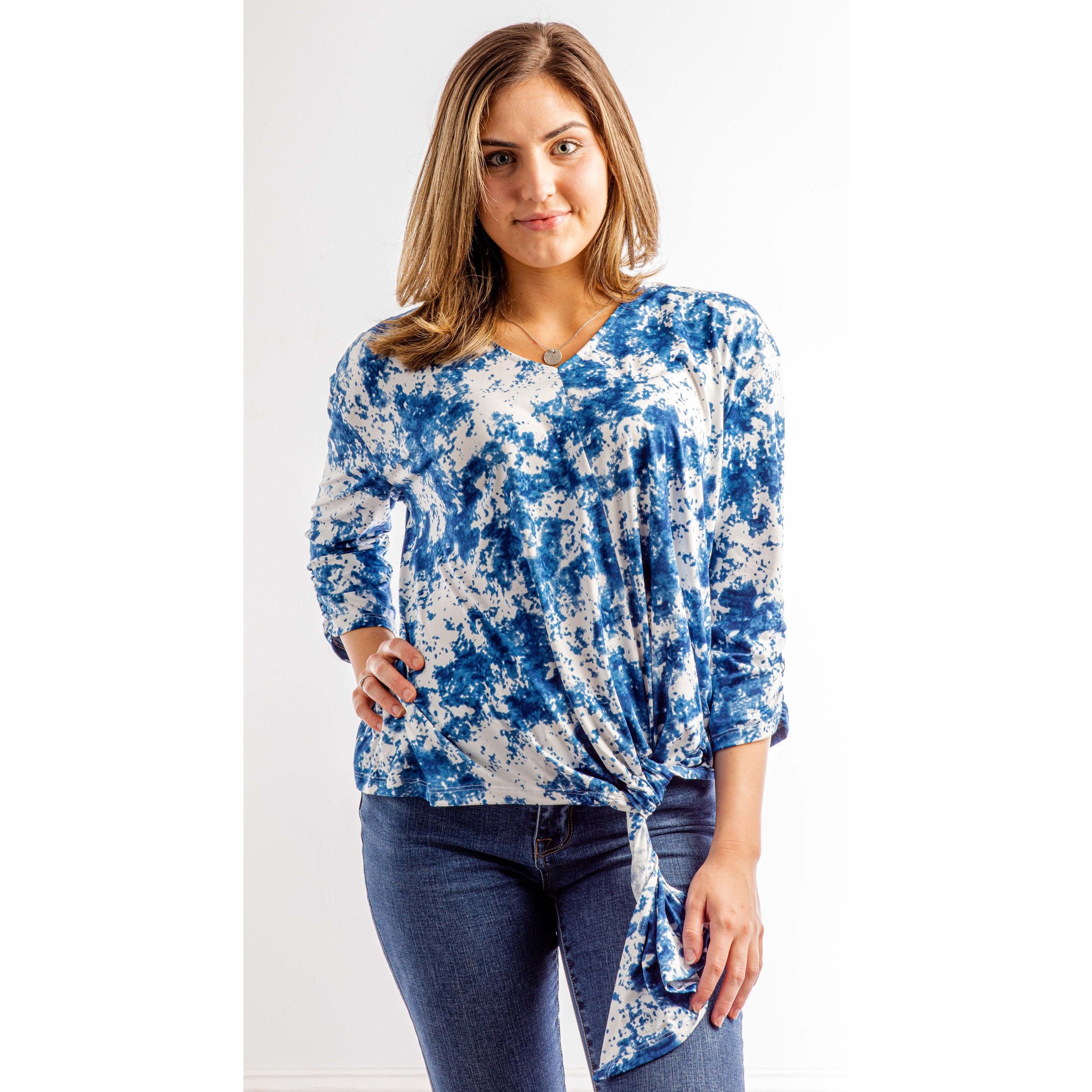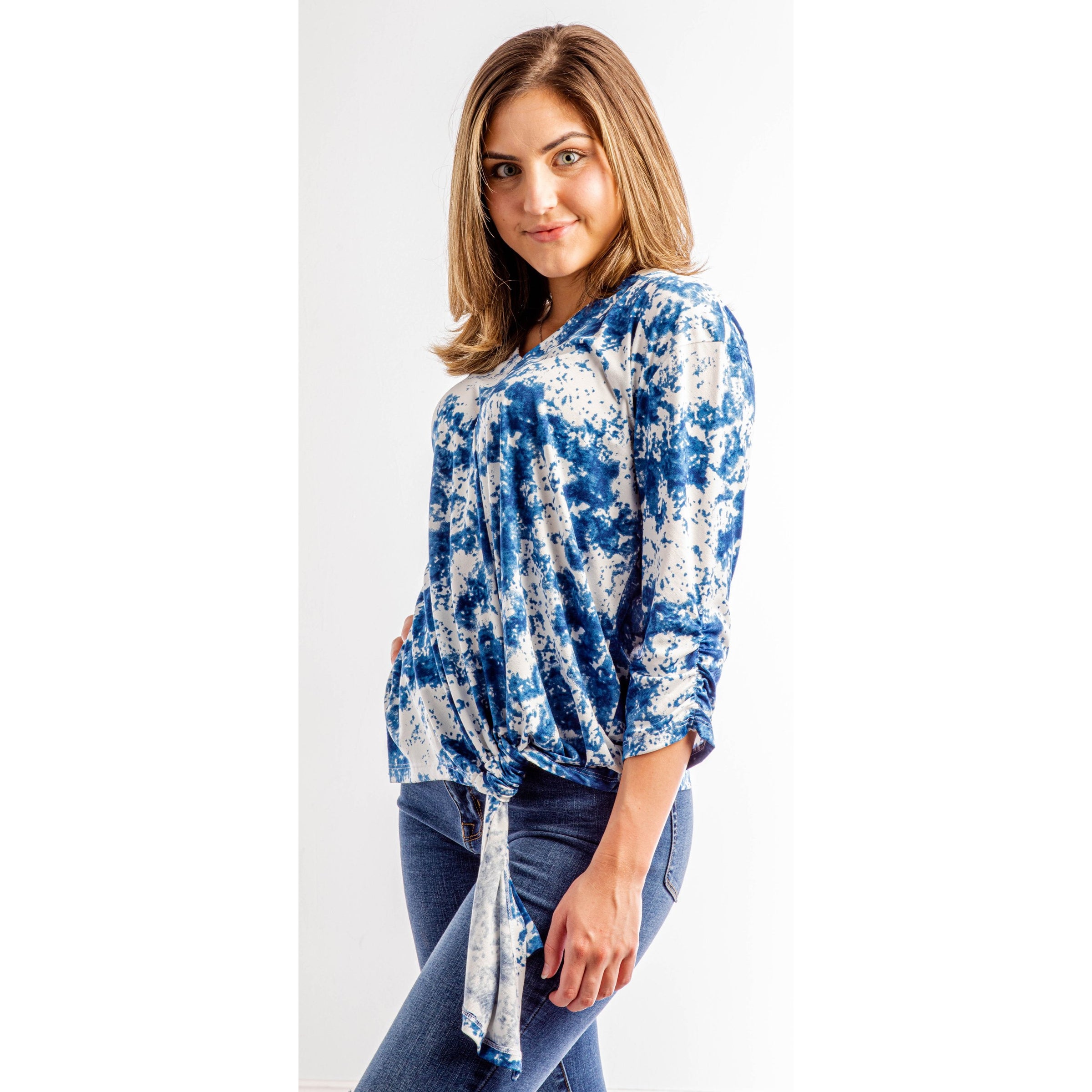 Our Bleu Skies 3/4 sleeved top is sure to brighten up your look and satisfy all your styling needs! Stunning "bleu" and white splatter print covers the top as it falls from a v-neck line and scrunches at. the sleeves. Twisted-tie front.