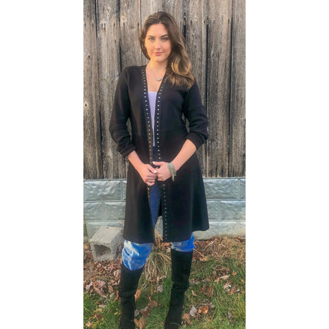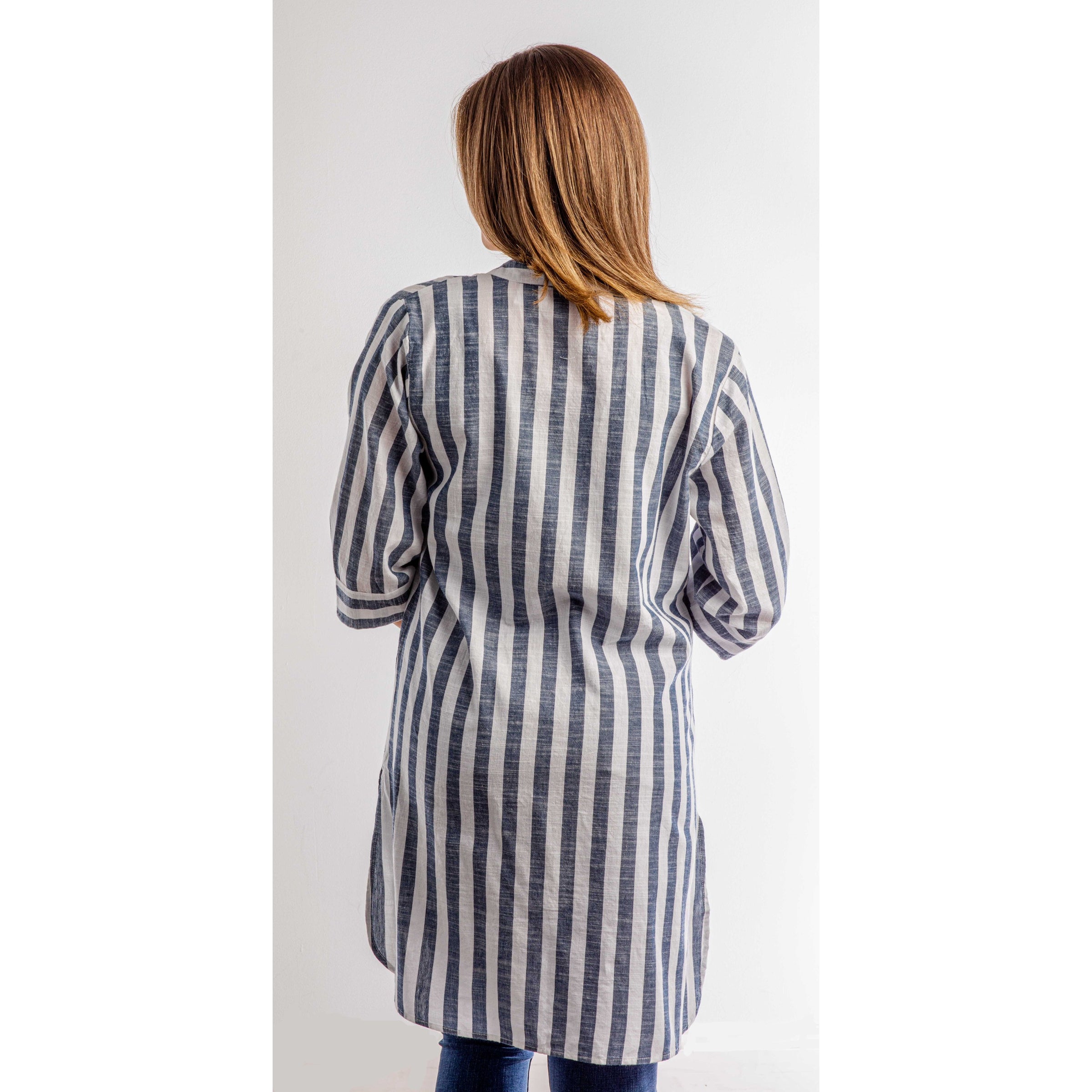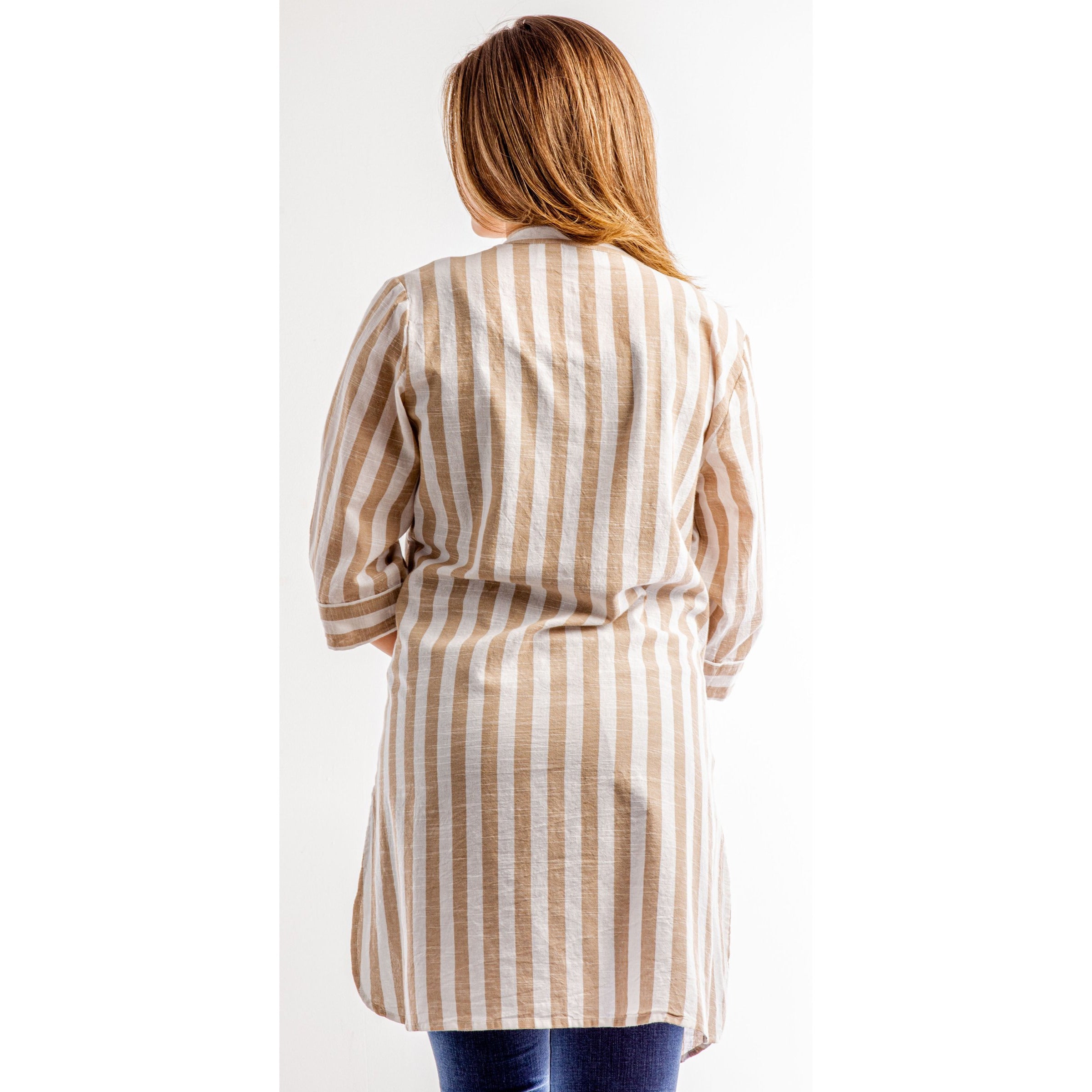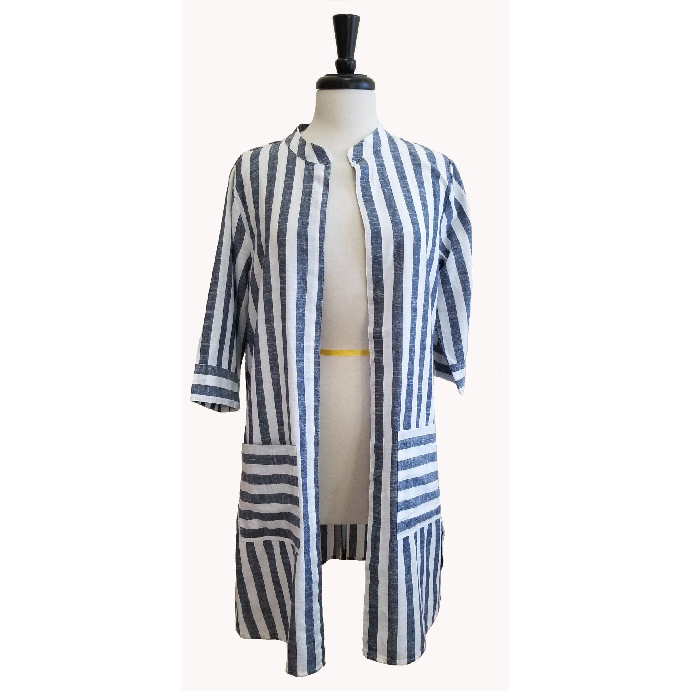 Our pretty, lightweight, striped duster is a Spring essential. It is perfect for throwing over a plain tank top or short-sleeve shirt as a flowing layering piece. Features side slits and pockets.