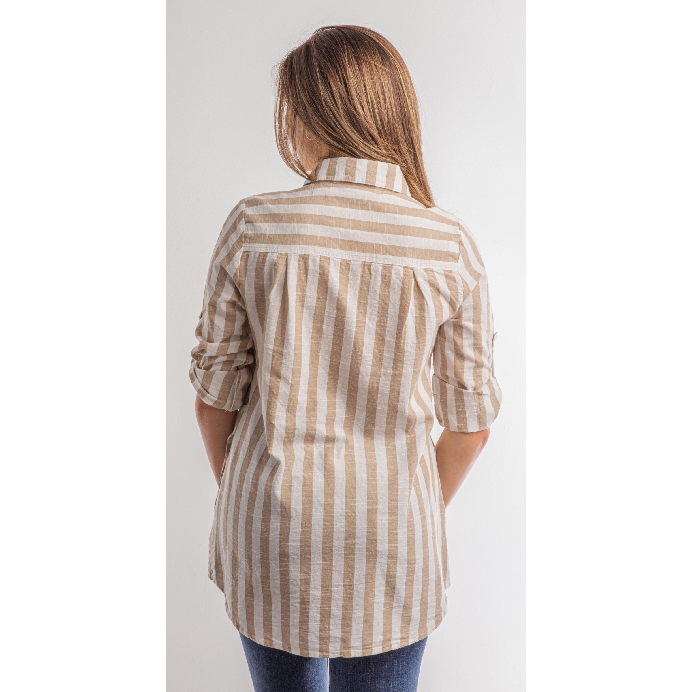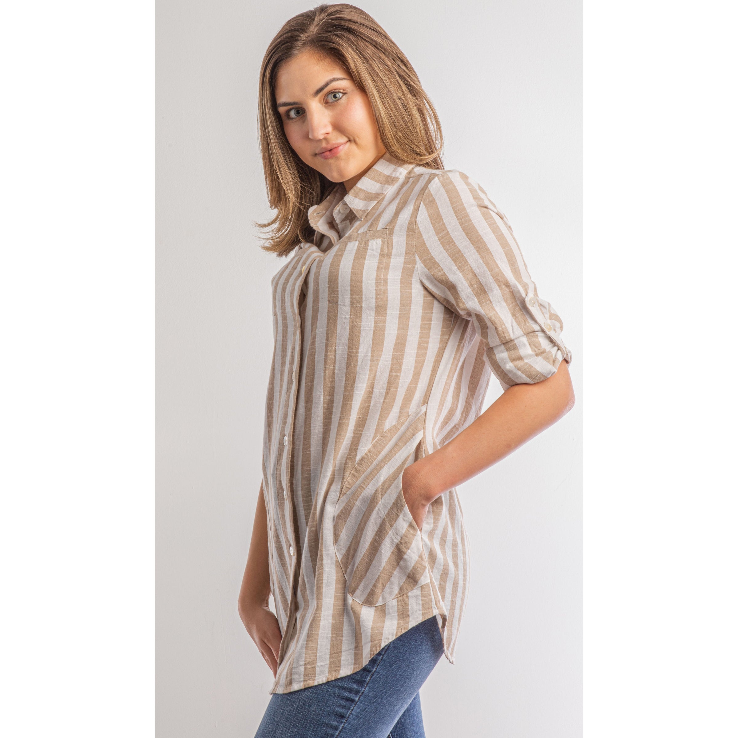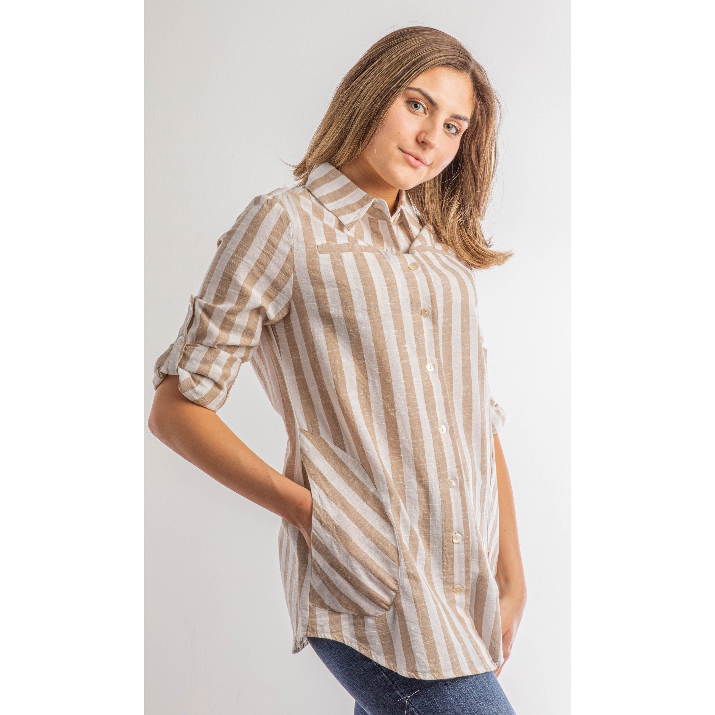 With a forever flattering tunic length, this button-down striped blouse will charm you with its accented pockets, button tab sleeves, and sophisticated collar neck. This essential, lightweight blouse can be dressed up or down.